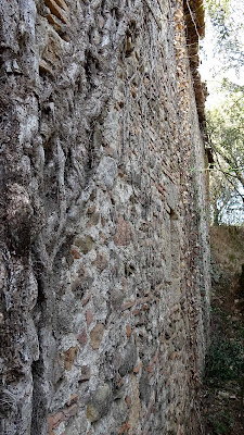 Al centre de la imatge veiem el cap del mur atalussat de la foto anterior, vist des de ponent. Observem que és ben poc gruixut. Crec que el mur serviria per evitar l'esllavissament d'aquest pa de terra de la dreta, damunt de la qual hi ha la masia.